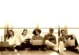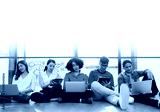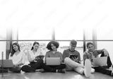 Group of young happy Asian creative business people or hipster student using electronic devices tablet and laptop connection together in modern office. Creative lifestyle young people concept