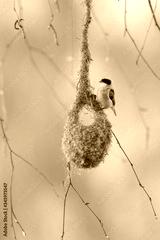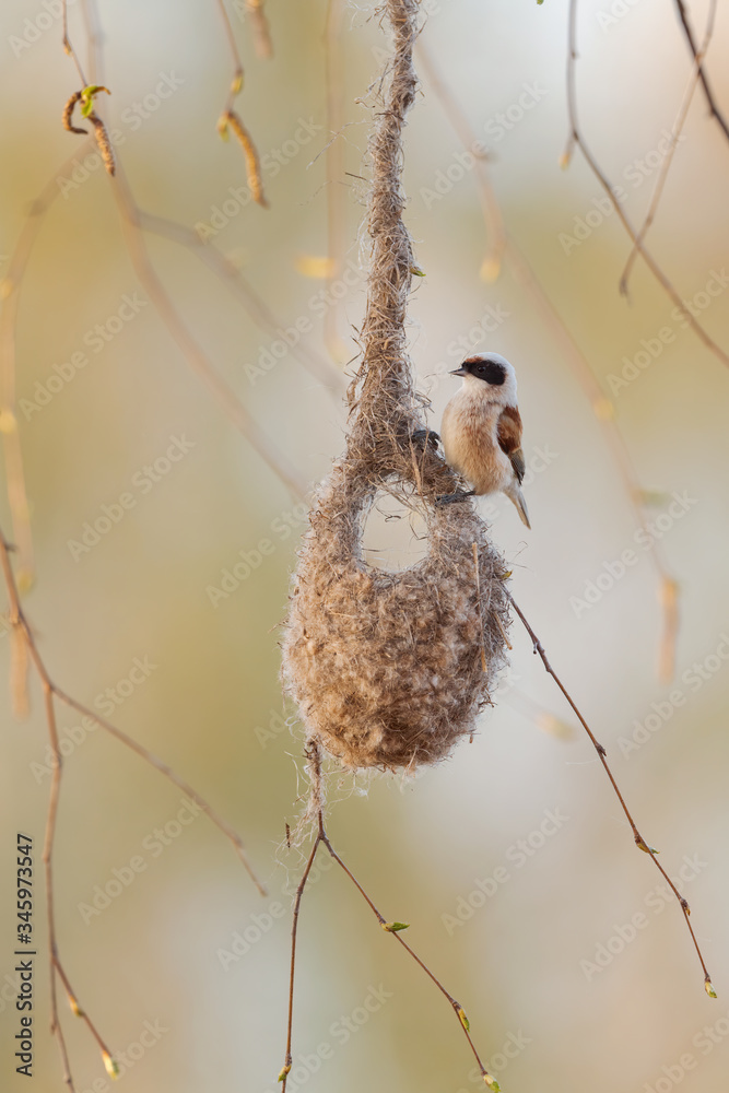 Penduline Tit - Remiz pendulinus, beatiful special perching bird building unique nest, European reeds and fresh water shores, Morava river, Czech Republic.