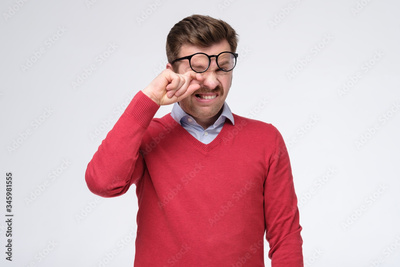 Tired caucasian man suffer from eyesight problems or blurry vision rubbing his eye.