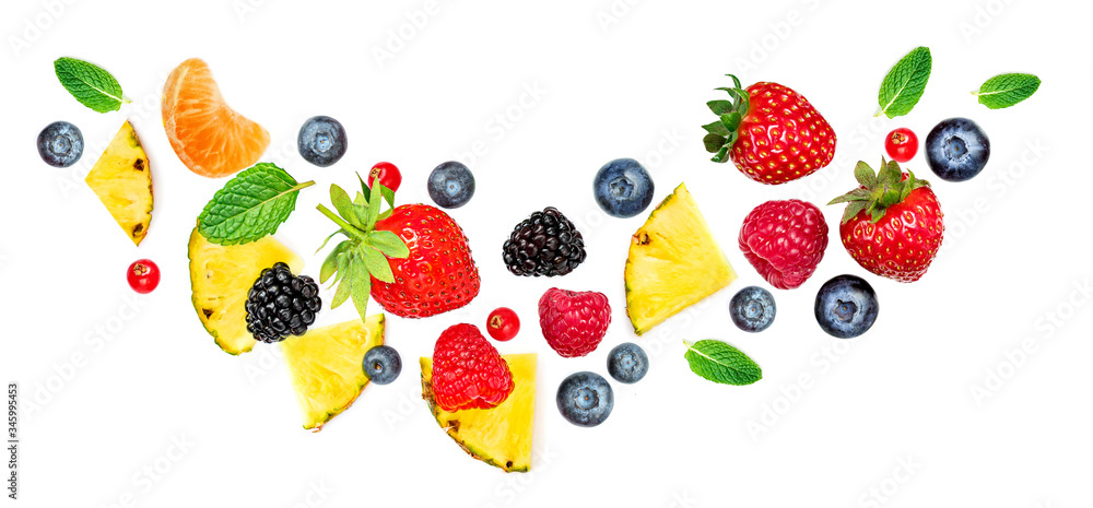 Creative layout made of summer fruits and mixed berries isolated on white background. Flat lay. Food concept..