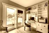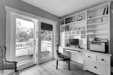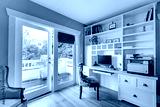 Home office with green walls and white shelves