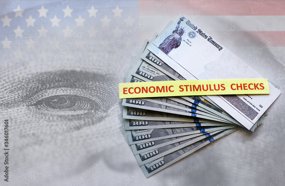 Financial stimulus payment to every us citizen because of the financial crisis caused by COVID-19. US dollar banknote. 100 dollar bills.1 dollar coin. Abstract background.