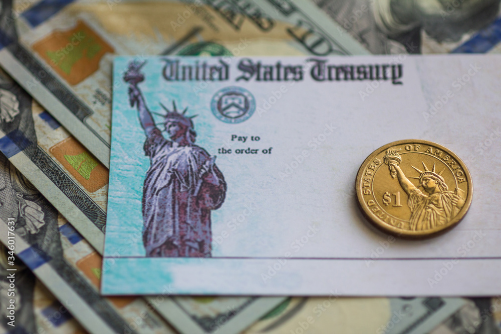 Financial stimulus payment to every us citizen because of the financial crisis caused by COVID-19. US dollar banknote. 100 dollar bills.1 dollar coin. Abstract background.