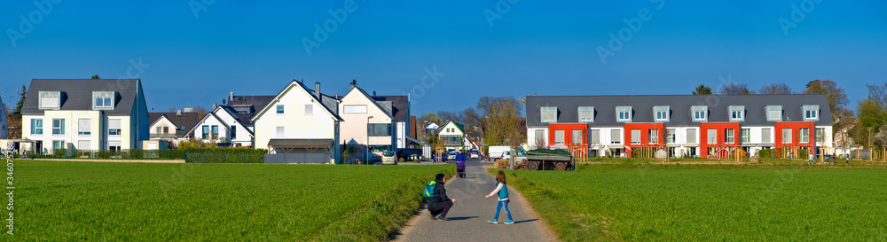 Mutter mit Kind auf Feldweg im Neubaugebiet