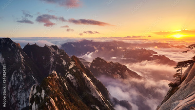 Huashan National Park mountain landscape at sunset, China.