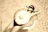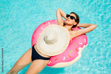 Enjoying suntan woman in bikini on the inflatable mattress