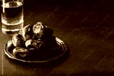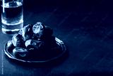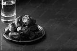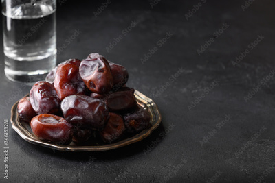 Ramadan Kareem. Iftar starts with glass of water and dates. Close up.