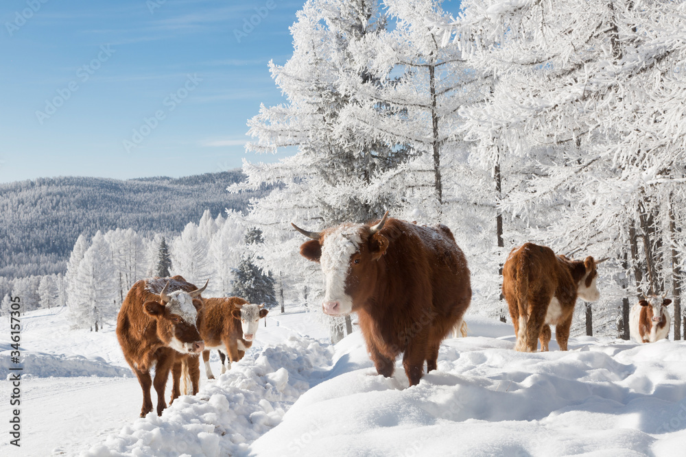 Cows in the winter , among the snowy trees. Altai Mountains, Russia