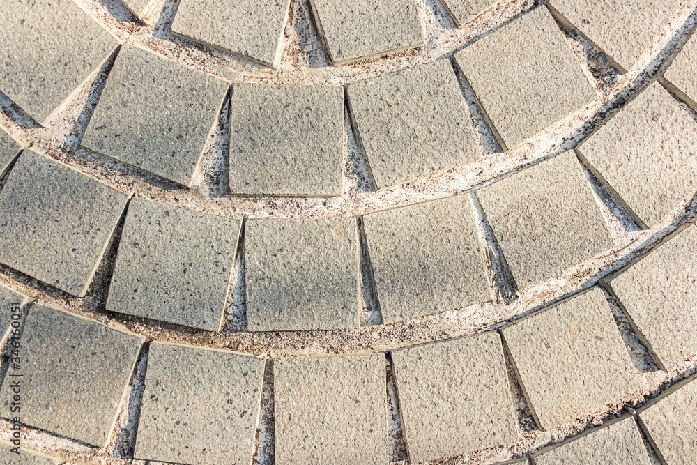 a fragment of a circular pattern of warm gray stone paving slabs for the background or texture.