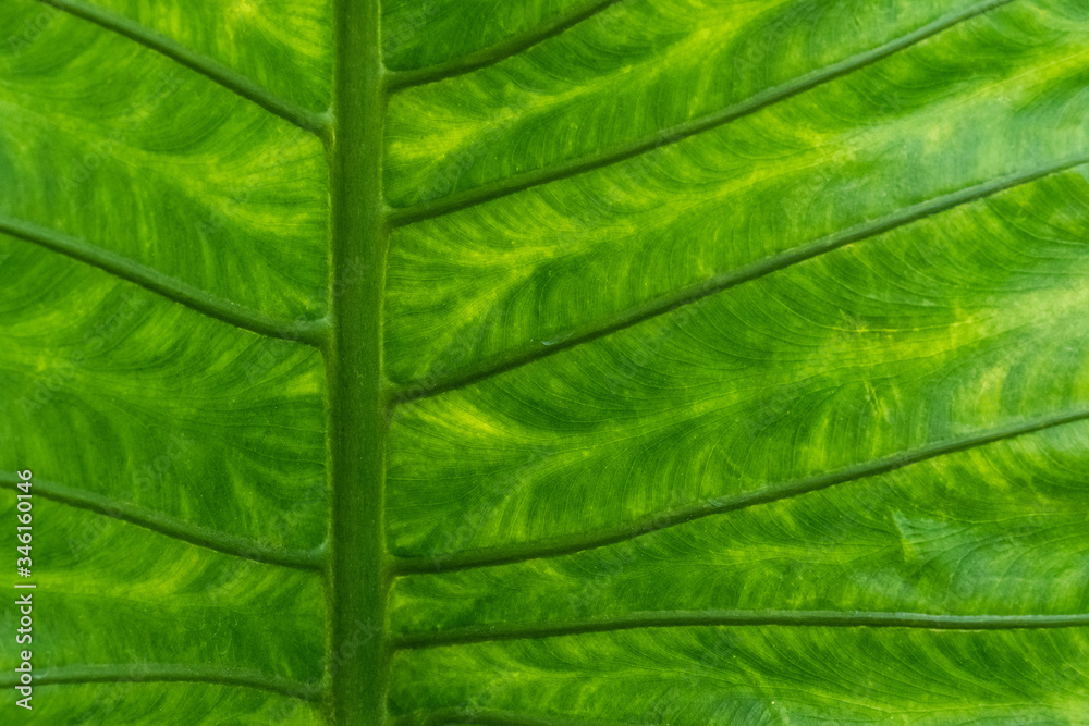 large tropical leaves, green and fresh close-up, in nature, for background and texture.