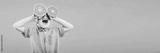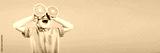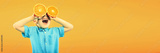 Happy cute boy is having fun played with fruit orange on yellow background wall. Bright photo of a boy. Colored panorama photo.