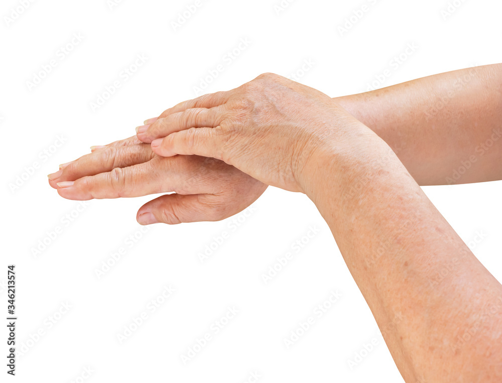 Elderly woman hand with apply cream gesture isolate is on white background with clipping path