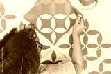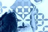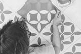 Home improvement concept: Top view of a femal painting tiles into blue using a vintage design stencil.