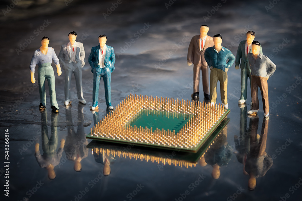 Group of miniature model of businessmen standing around the cpu in a reflective surface. Microelectronic engineering concept.