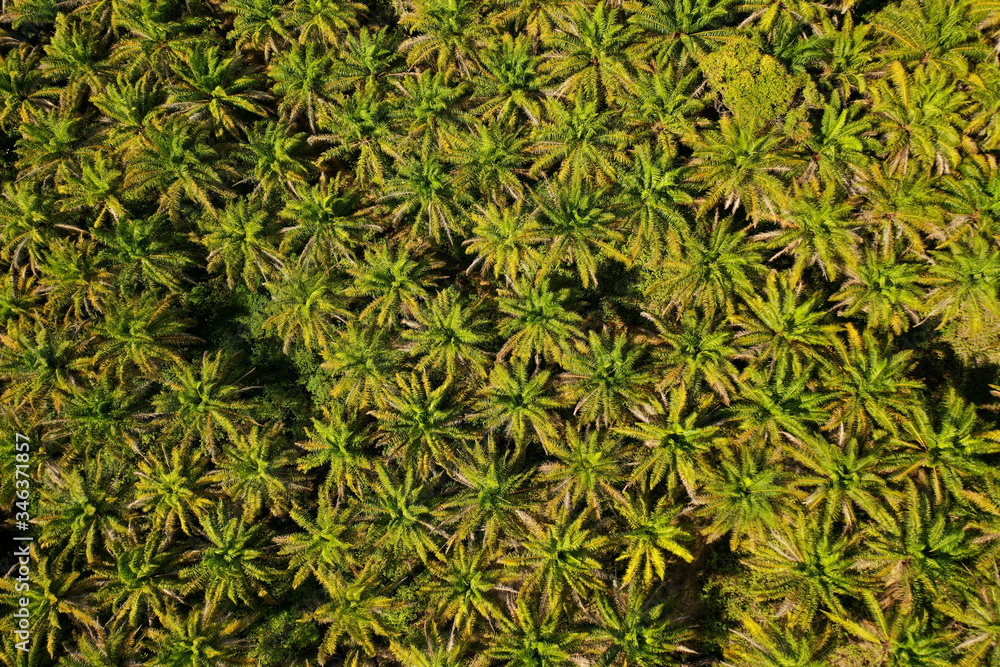Oil Palm plantation from above. Aerial drone view of palm trees