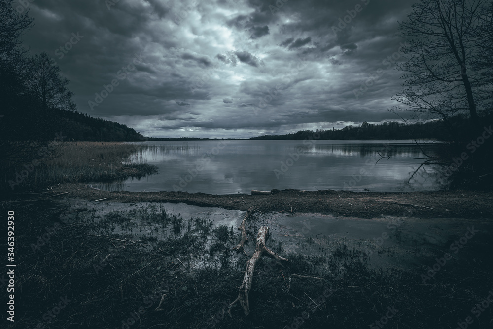 Brzeg jeziora Hańcza na tle zachmurzonego nieba
