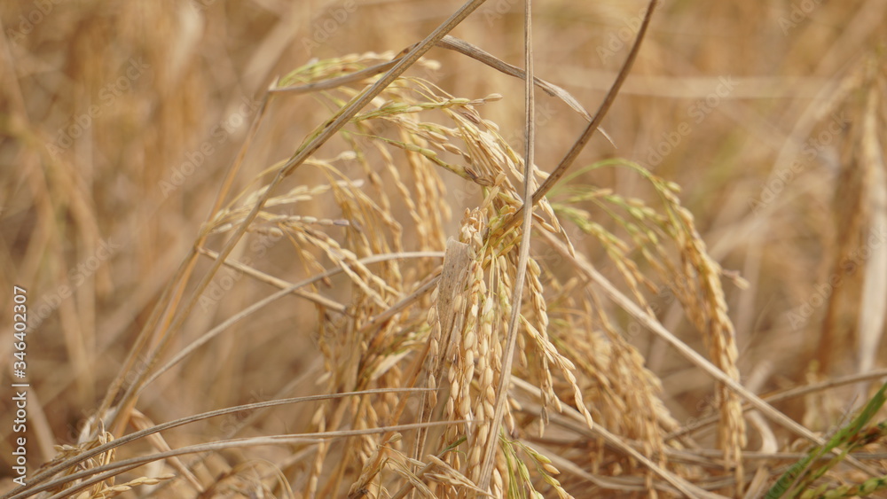 Golden Rice On the Field. Rice is the seed of the grass species Oryza glaberrima or Oryza sativa.