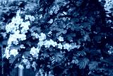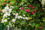 flowering tree with white and pink small lush flowers in spring