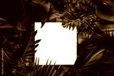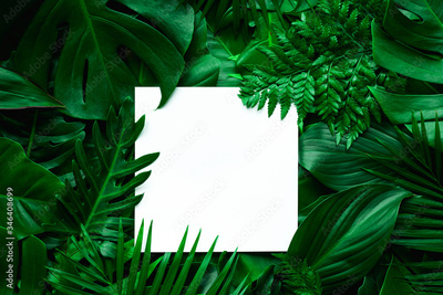 tropical green leaves and palms with white paper note frame, nature flat lay concept