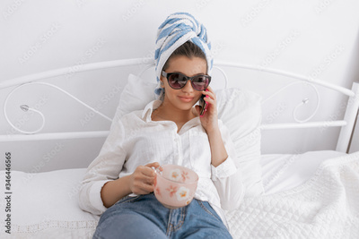 Cute pretty girl is wearing towel on her head talking phone with friends. Beauty and stay home concept.