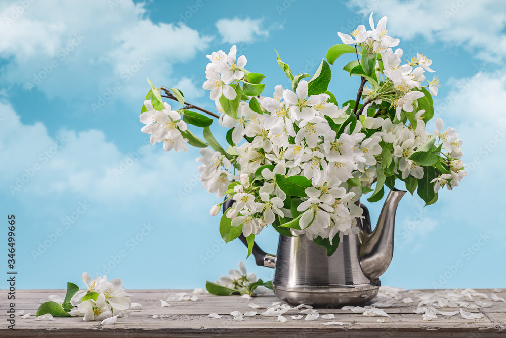 Apple tree flowers. Beautiful background of flowering branches of apple trees. Spring bouquet of white flowers.