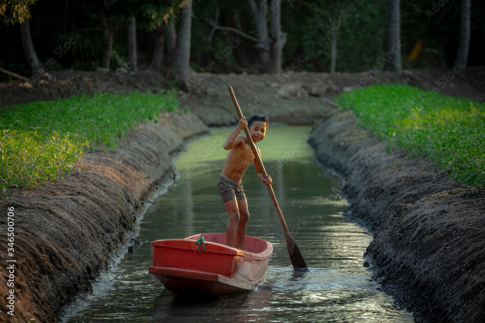 Boy playing in vegetables farm near the Damnoen Saduak floating market, Ratchaburi Province