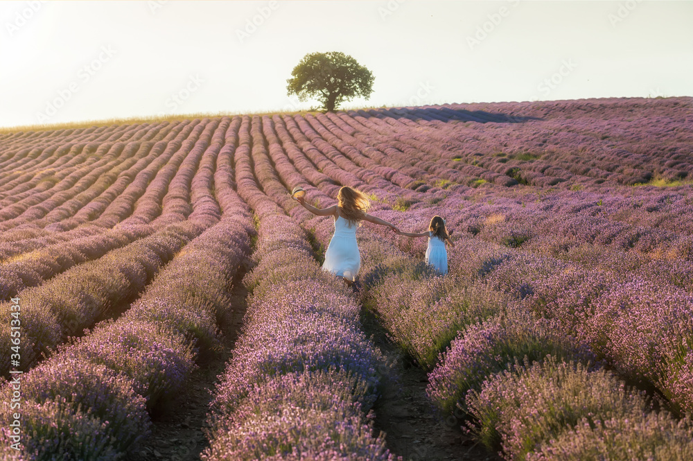 Rear view of mother with her daughter in white dresses, running between rows of blooming lavender field at golden hour before sunset