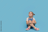 Internetional childrens day. Portrait of surprised excited child girl isolated over blue background. Empty space for text. Advertising baby products.