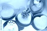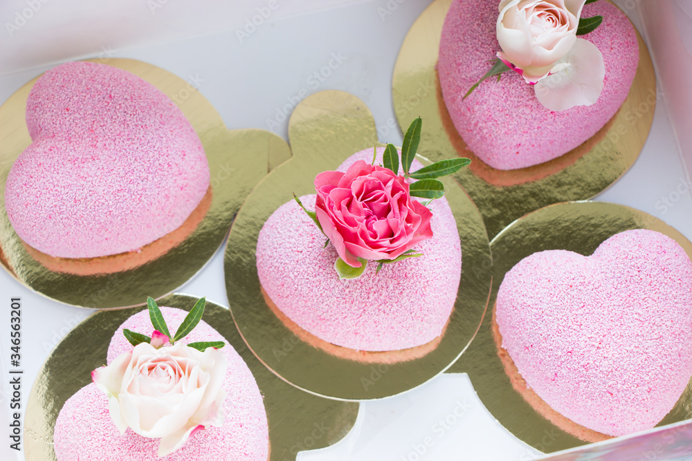 Heart mousse cakes covered with pink chocolate velvet decorated of pink flowers