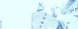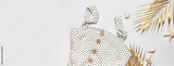 Summer women's white dress in black peas with natural wooden buttons, golden palm leaf, shells, starfish on light background. Flat lay top view copy space. Women's beach fashion travel vacation