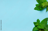 Fresh green leaves of mint, lemon balm, peppermint on blue background top view copy space. Mint leaf texture. Ecology natural layout. Flat lay Mint leaves pattern spearmint herbs nature background