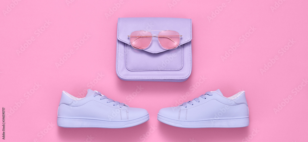 Fashion accessories minimal flat lay. Trendy shoes sneakers, handbag clutch. Pop art purple concept. Woman fashionable accessories on pink, top view, banner. Creative design color