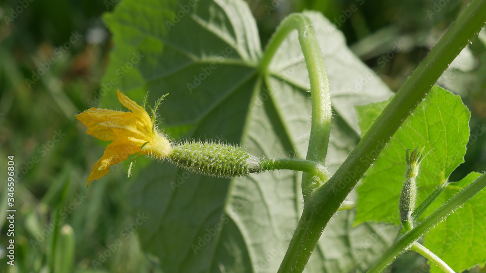 Young cucumber plant, a flower with the ovary of a small fruit close-up. Selective focus.