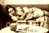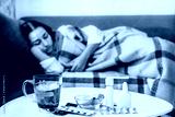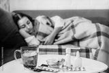 Table with pills and medicine near blurred Young woman who is feeling bad and sick lying in the bed at home. Girl has symptoms of respiratory viral infection, Coronavirus covid-19 epidemic concept.