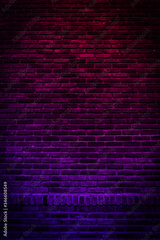 Neon light on brick walls that are not plastered background and texture. Lighting effect red and blue neon background vertical of empty brick basement wall.