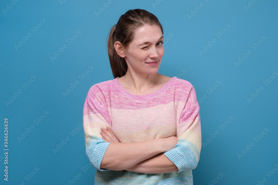 Young caucasian woman portrait with a positive and winking, flirty facial expression.