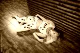 Crime scene (imitation). Pretty woman lying on the floor. She shot in the chest.