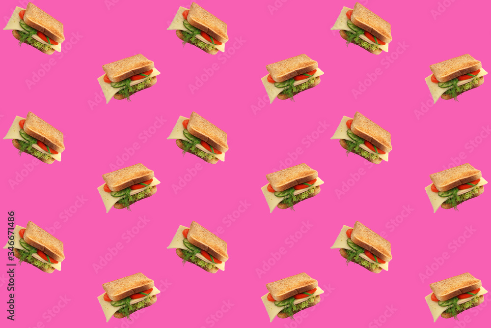 bright pop art, sandwich seamless pattern with cheese, lettuce, tomatoes, cucumbers, sausage, dill and green onions, the concept of a healthy diet, diet, snack at work, at school, student fast food