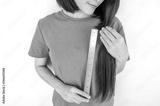 Portrait of attractive Asian woman measuring her hair before cutting for donation. Usable hair can turn your long locks into free or low-cost wigs for people with cancer.