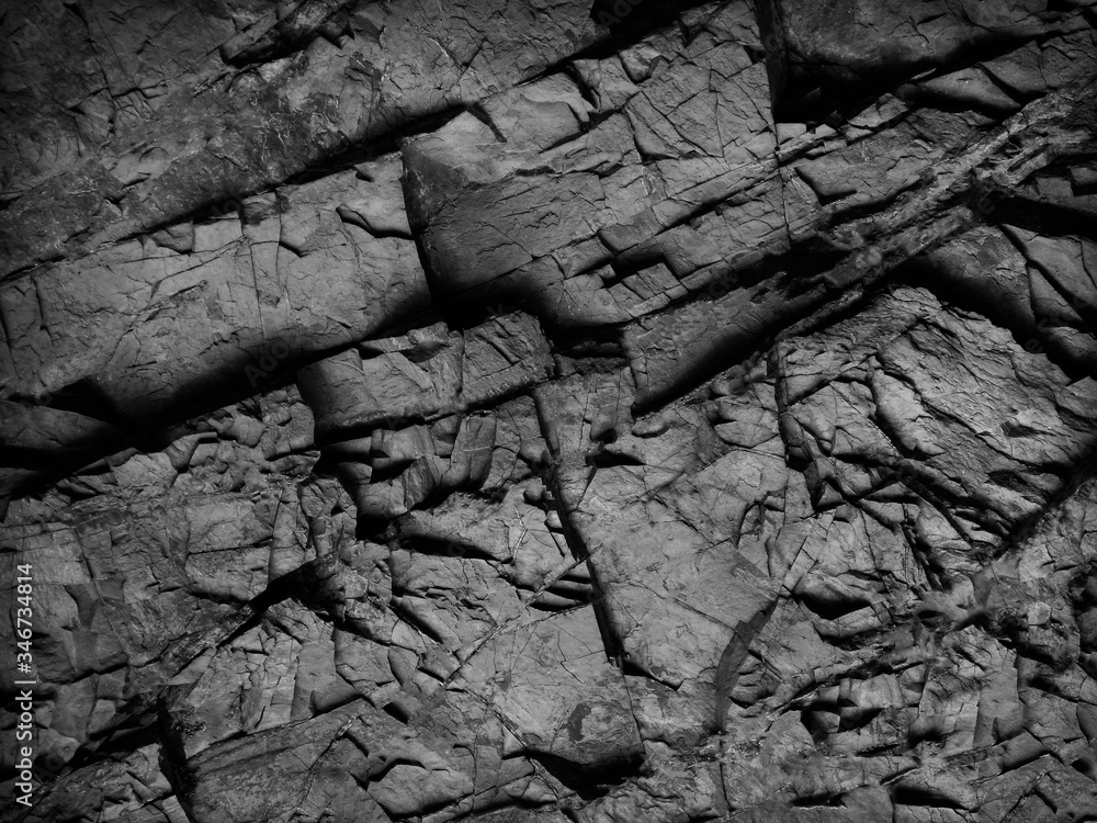 Black and white background. Black grunge background. Rock texture. Close-up.