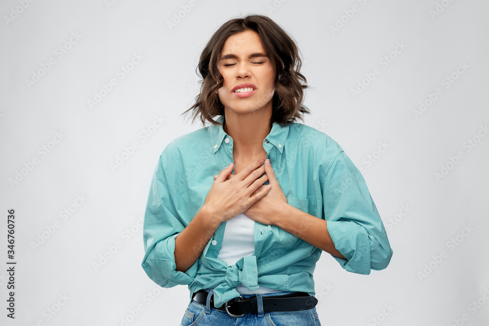 people concept - young woman in turquoise shirt having heartache or heartburn over grey background