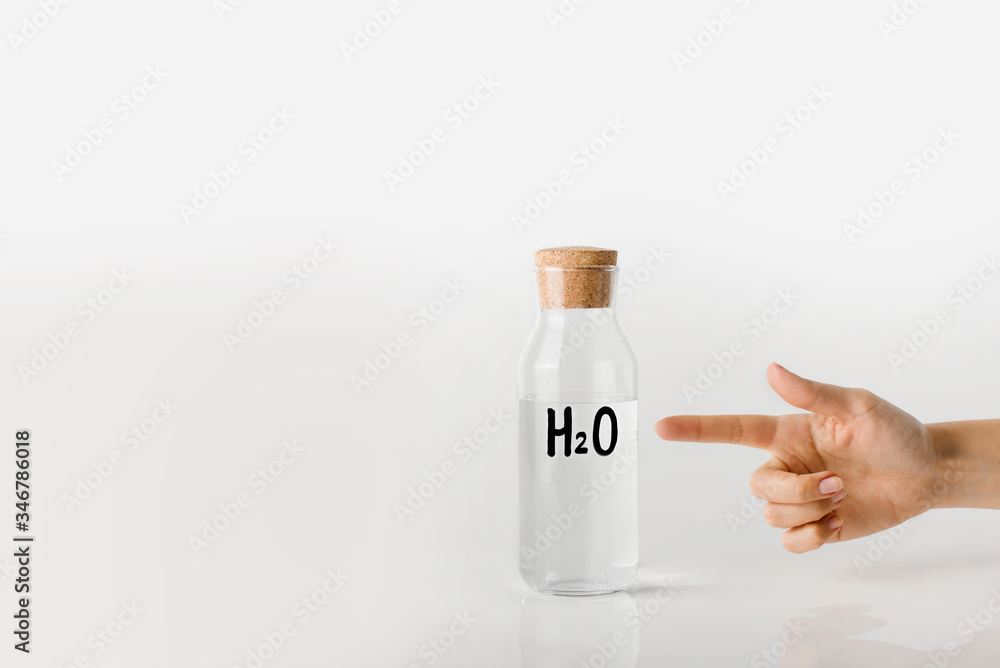 A hand points a finger at a glass bottle with the chemical formula of water on it and a clear white liquid inside.
