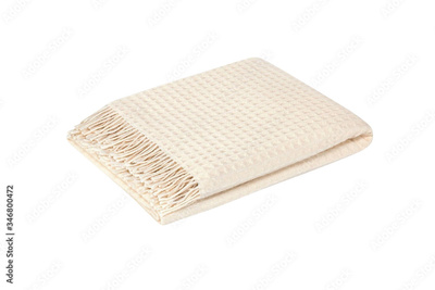 Beige duvet, blanket or bedspread. Wafer towels stack, grey towels in stack against the white backdrop. Pile, stock of thick organic cotton bath towels on white background. Beige plaid close up photo