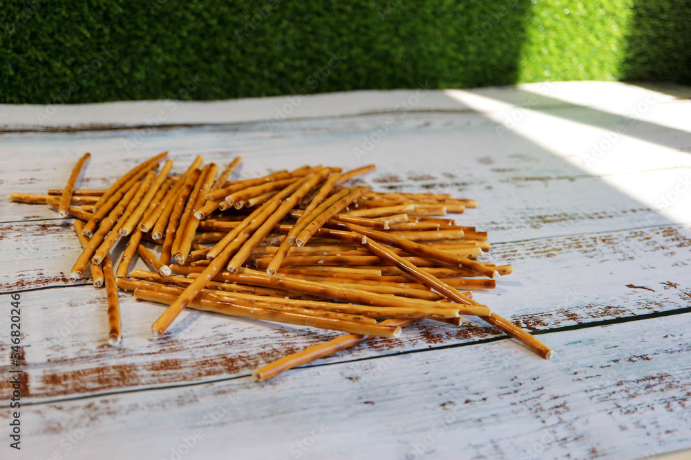 bunch of tasty crispy crunchy salt bread sticks on wooden background close up