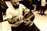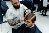 Attractive male is getting a modern haircut in barber shop. Tattooed Barber wets hair by spray and combs them.
