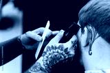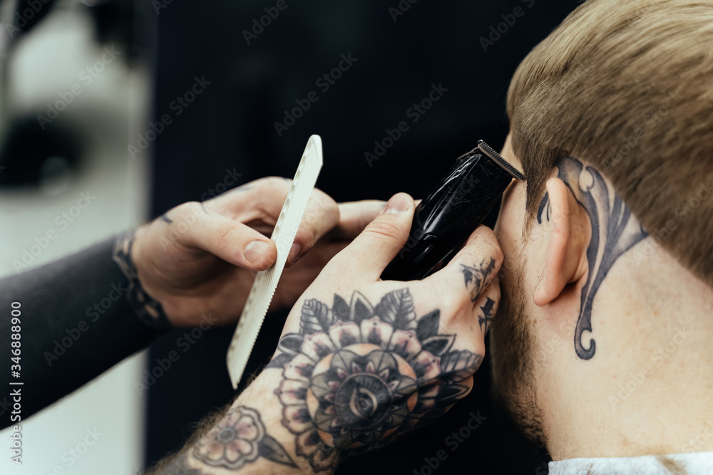 Male haircut with electric razor. Tattooed Barber makes haircut for client at the barber shop by using hairclipper. Man hairdressing with electric shaver.