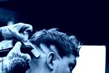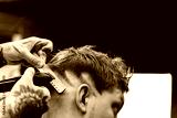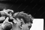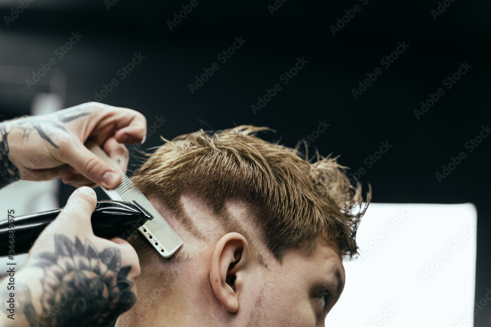 Male haircut with electric razor. Tattooed Barber makes haircut for client at the barber shop by using hairclipper. Man hairdressing with electric shaver.