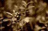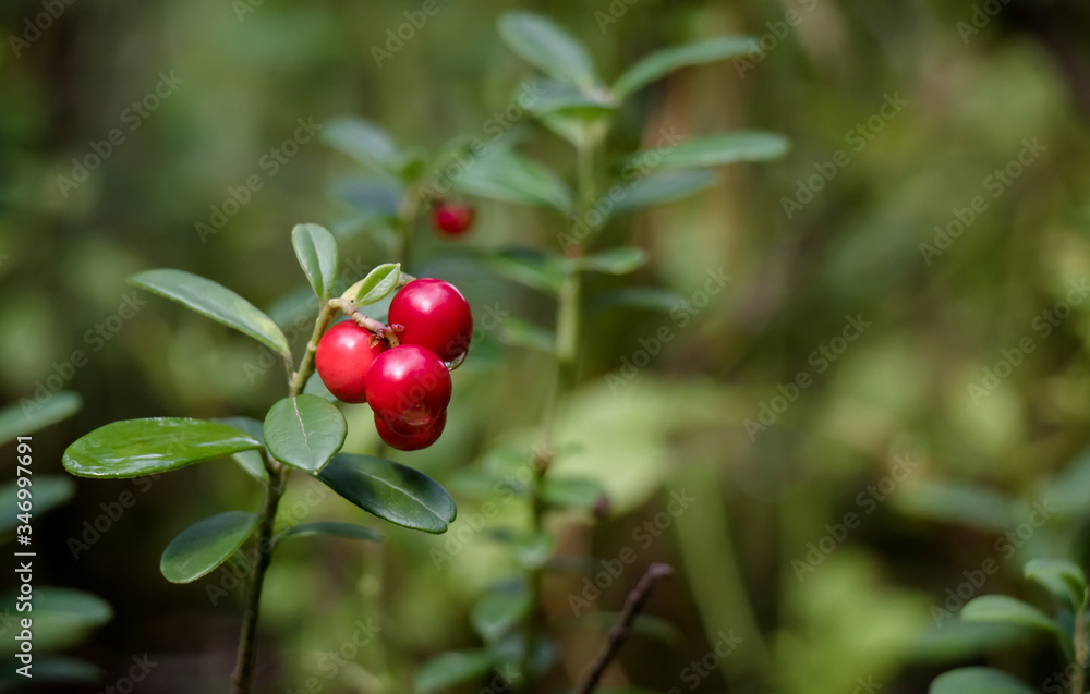 Lingonberry growing in the forest closeup.