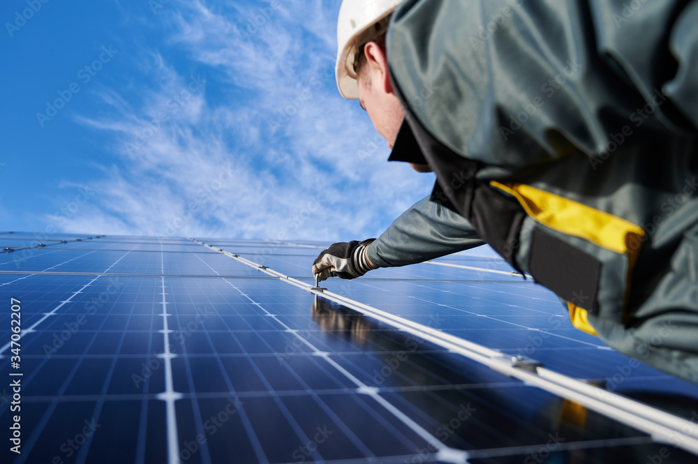 Electrician in safety helmet, uniform and working gloves, setting a shiny new solar battery with help of hex key, blue sky on background. Concept of alternative green energy sources and innovations.