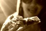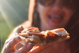 Beautiful middle aged woman bite a slice of pizza. Attractive woman eating pizza in sunset